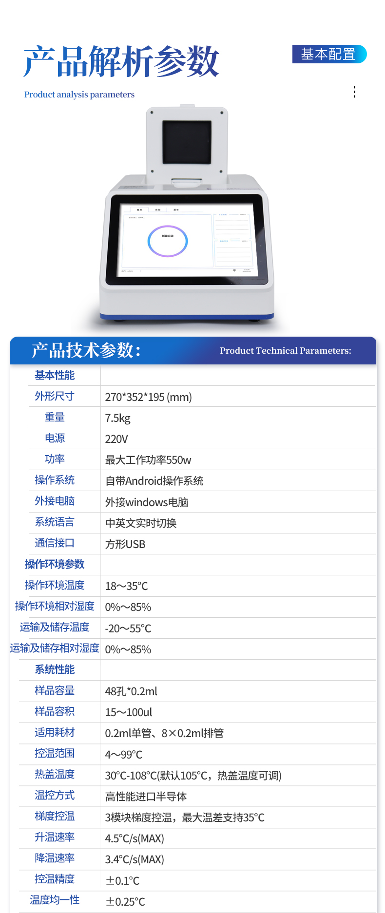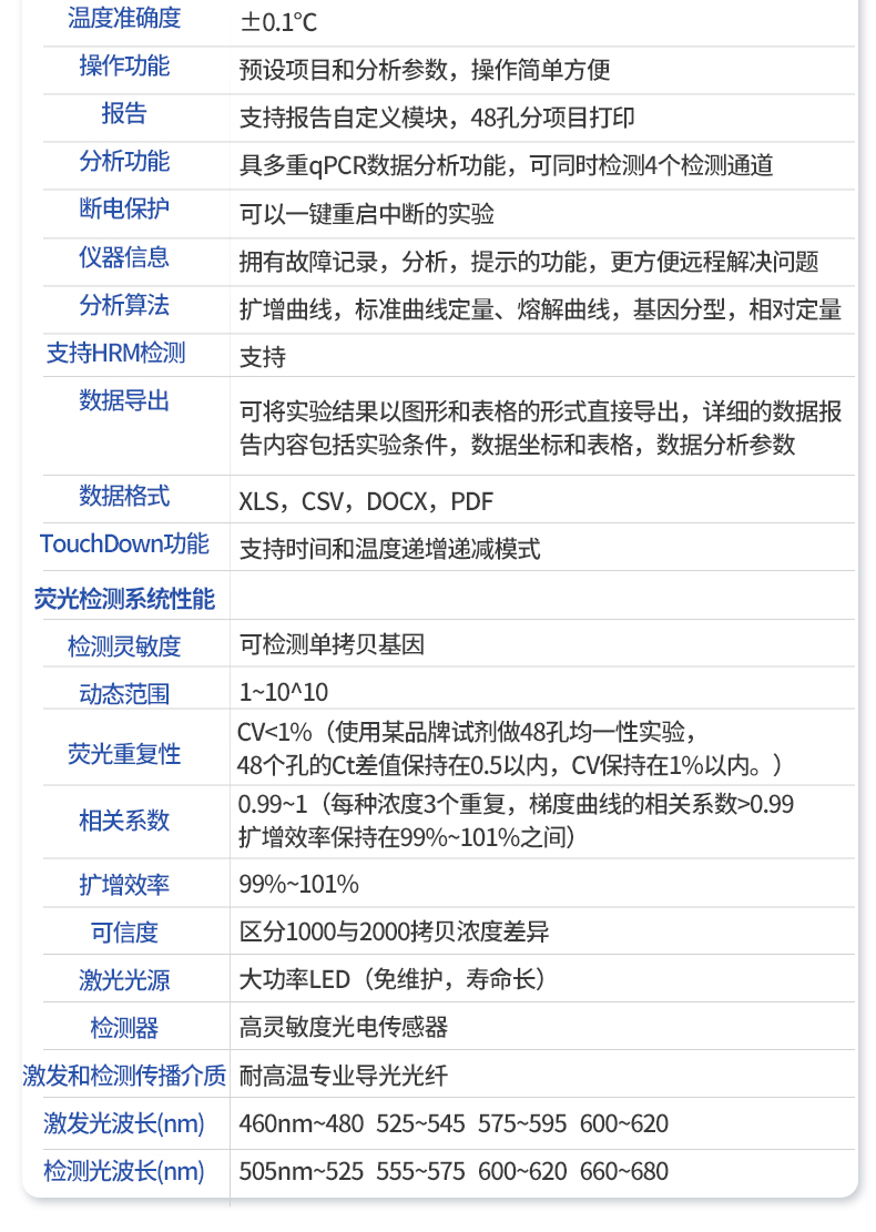 | 基本性能 | 外形尺寸:270*352*195 (mm) | 重量:7.5kg | 电源:220V | 功率:**工作功率550w | 操作系统:自带Android操作系统 | 外接电脑:外接windows电脑(win7系统以上) | 系统语言:中英文实时切换 | 通信接口:方形USB | 操作环境参数 | 操作环境温度:18~35℃ | 操作环境相对湿度:0%~85% | 运输及储存温度:-20~55℃ | 运输及储存相对湿度:0%~85% | 系统性能 | 样品容量:48孔*0.2ml | 样品容积:15~100ul | 适用耗材:0.2ml单管、8×0.2ml排管 | 控温范围:4~99℃ | 热盖温度:30℃-108℃(默认105℃,热盖温度可调) | 温控方式:高性能进口半导体 | 梯度控温:3??樘荻瓤匚拢?*温差支持35℃ | 升温速率:4.5℃/s(MAX) | 降温速率:3.4℃/s(MAX) | 控温精度:±0.1℃ | 温度均一性:±0.25℃ | 温度准确度:±0.1℃ | 操作功能:预设项目和分析参数,操作简单方便 | 报告:支持报告自定义模块,48孔分项目打印 | 分析功能:具多重qPCR数据分析功能,可同时检测4个检测通道 | 断电?;ぃ嚎梢砸患仄糁卸系氖笛? | 仪器信息:拥有故障记录,分析,提示的功能,更方便远程解决问题 | 分析算法:扩增曲线,标准曲线定量、熔解曲线,基因分型(SNP),相对定量 | 支持HRM检测:支持 | 数据导出:可将实验结果以图形和表格的形式直接导出;详细的数据报告内容包括实验条件,数据坐标和表格,数据分析参数。 | 数据格式:XLS, CSV, DOCX,PDF | TouchDown功能:支持时间和温度递增递减模式 | 荧光检测系统性能 | 检测灵敏度:可检测单拷贝基因 | 动态范围:1~10^10 | 荧光重复性:CV<1%(使用某品牌试剂做48孔均一性实验,48个孔的Ct差值保持在0.5以内,CV保持在1%以内。) | 相关系数:0.99~1(每种浓度3个重复,梯度曲线的相关系数>0.99,扩增效率保持在99%~101%之间) | 扩增效率:99%~101% | 可信度:区分1000与2000拷贝浓度差异 | 激光光源:大功率LED(免维护,寿命长) | 检测器:高灵敏度光电传感器 | 激发和检测传播介质:耐高温专业导光光纤 | 激发光波长:460nm~480nm , 525nm~545nm, 575nm~595nm ,600nm~620nm | 检测光波长:505nm~525nm , 555nm~575nm , 600nm~620nm , 660nm~680nm |