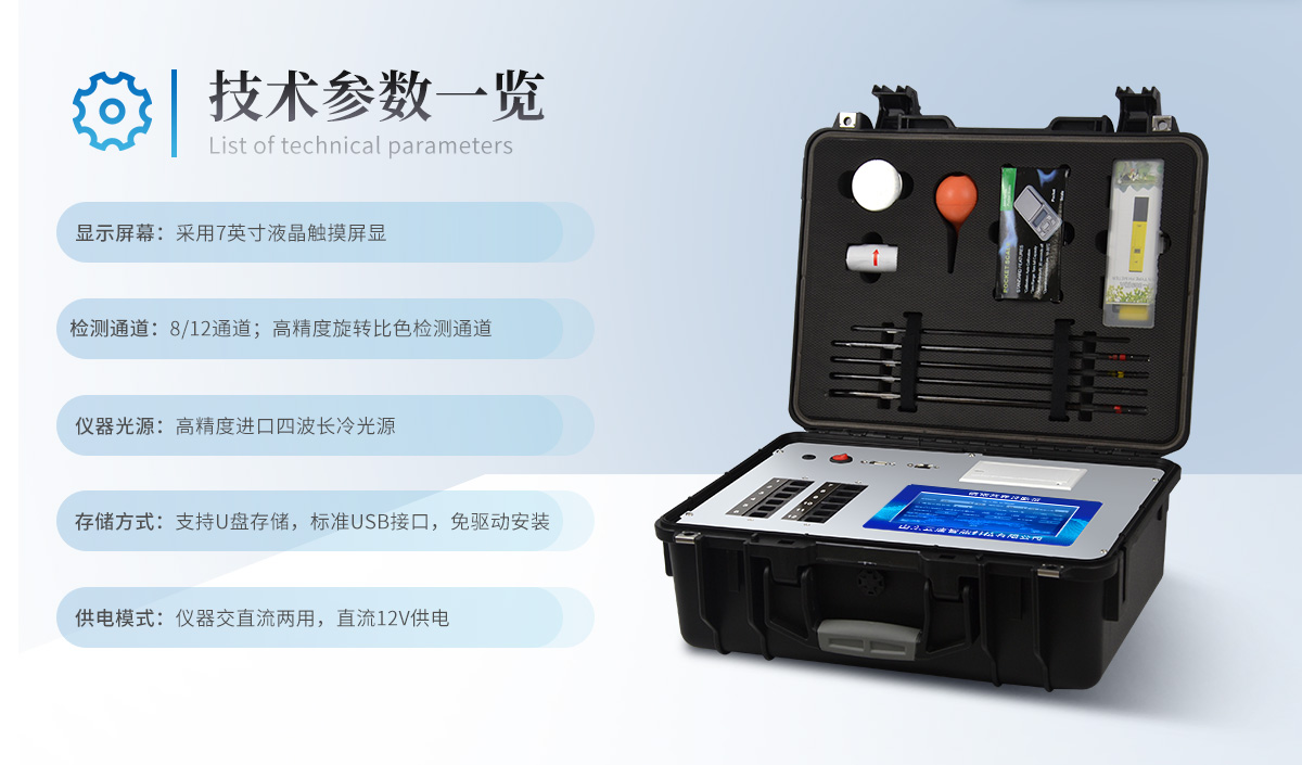 | 功能全:测试项目国内外全面(各类药剂均可选购)。 | 配套齐全:该仪器集药、器、仪为一体,携带方便,相当于一个小型实验室。适于农业服务部门或农资经销商、肥料厂商、庄家医院进行农化服务。 | 操作简便、速度快捷,成品药剂开瓶即用,无须配置。 |
